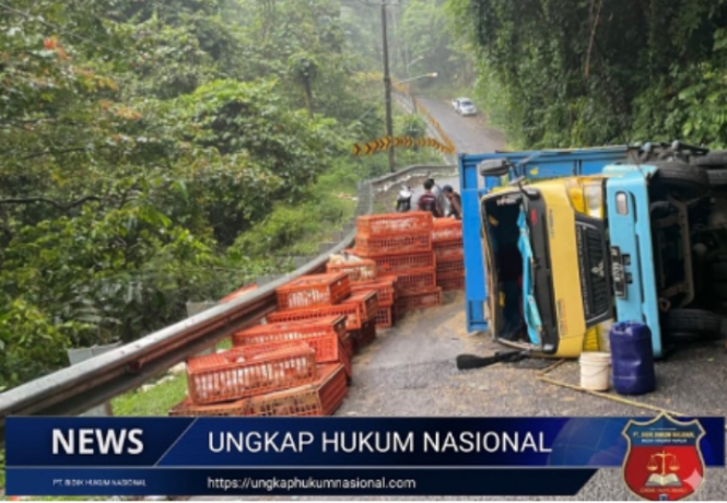 Satu Unit Kendaraan Mobil Truk Terguling di Tanjakan Cisarakan Palabuhanratu Sukabumi, Satlantas Lakukan Pengamanan