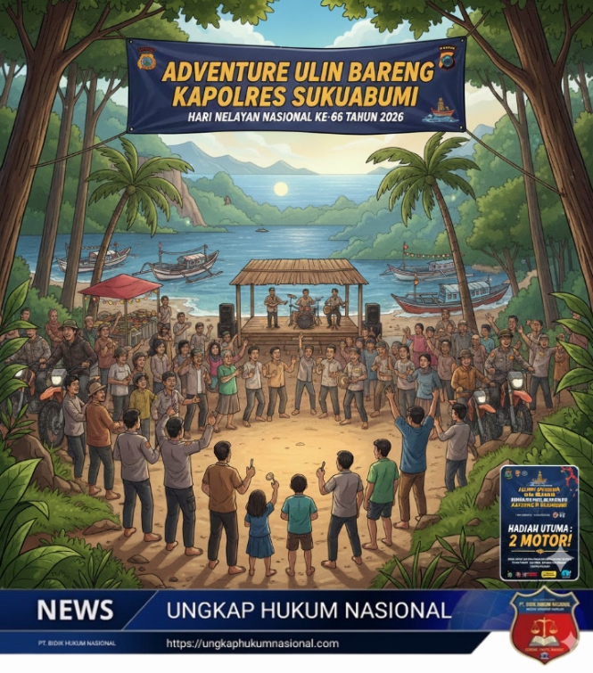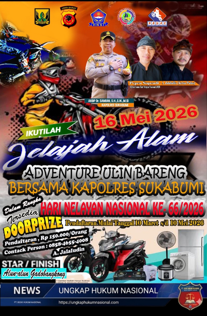 SUKABUMI — ungkaphukumnasional.com // Dalam rangka memperingati Hari Nelayan Nasional ke-66 Tahun 2026, panitia akan menggelar kegiatan Adventure Ulin Bareng Kapolres Sukabumi pada Sabtu, 16 Mei 2026. Kegiatan ini menjadi salah satu agenda utama yang mengusung konsep jelajah alam sekaligus mempererat sinergi antara Polri, nelayan, komunitas, dan masyarakat.