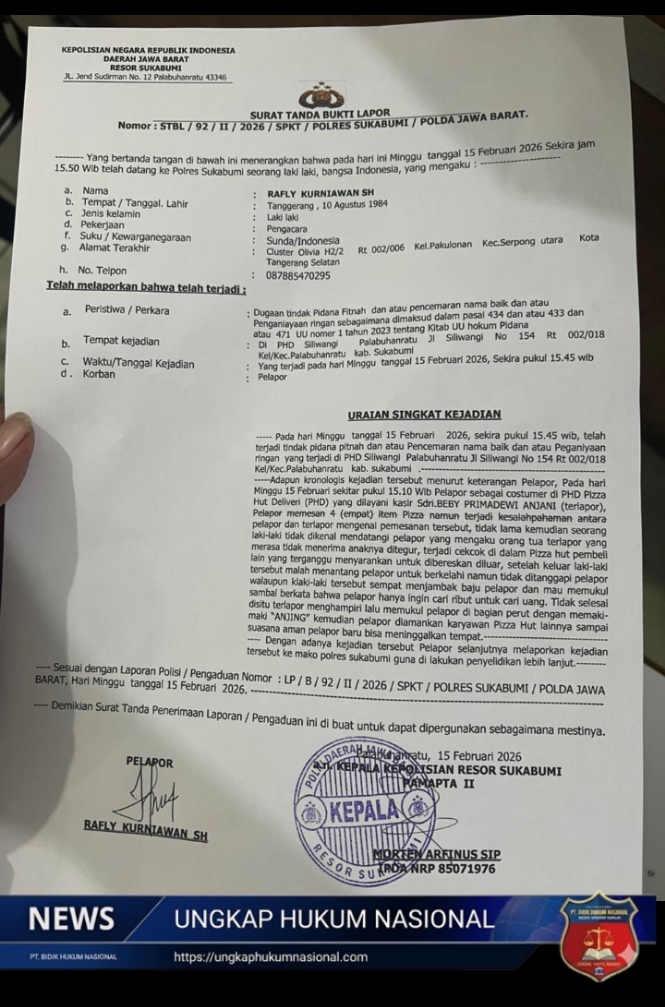 SUKABUMI – ungkaphukumnasional.com // Insiden dugaan penganiayaan, pengancaman, serta pencemaran nama baik terjadi di gerai Pizza Hut Delivery (PHD) Pelabuhan Ratu, Kabupaten Sukabumi, pada Sabtu (15/2/2026) sekitar pukul 15.30 WIB. Seorang pelanggan mengaku menjadi korban tindakan tidak profesional hingga kekerasan fisik yang diduga dilakukan oknum pegawai.