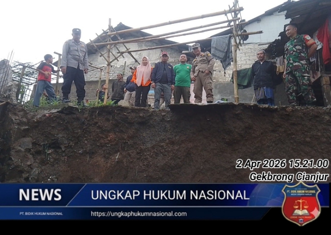 CIANJUR – ungkaphukumnasional.com || Hujan deras yang mengguyur wilayah selatan Kabupaten Cianjur sejak siang hari mengakibatkan bencana tanah longsor di permukiman padat penduduk. Tebing setinggi dua meter di Kampung Awilarangan RT 01/RW 06, Desa Cikahuripan, Kecamatan Gekbrong, ambrol dan menimpa bangunan dapur dua rumah warga, Kamis (2/4/2026).