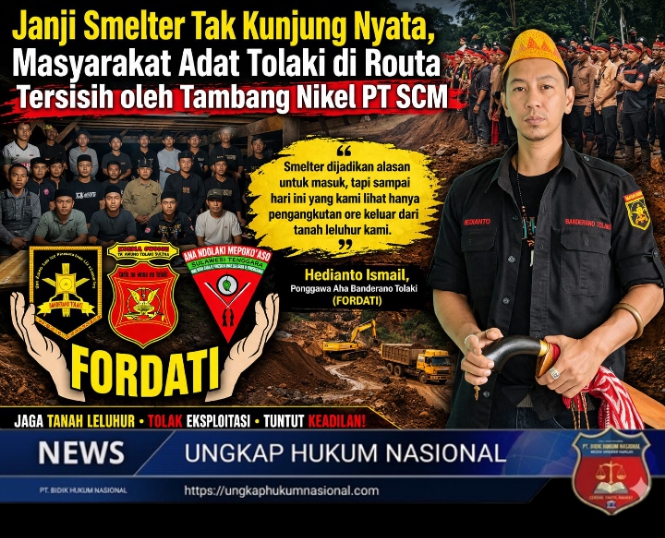 Konawe — ungkaphukumnasional.com Kekhawatiran terhadap aktivitas pertambangan nikel di Kecamatan Routa, Kabupaten Konawe, semakin menguat. Forum Pemuda Adat Tolaki menyoroti dugaan ketidaksesuaian antara komitmen investasi PT Sulawesi Cahaya Mineral (PT SCM) dengan kondisi yang terjadi di lapangan, khususnya terkait janji pembangunan smelter dan dampak lingkungan yang dirasakan masyarakat.