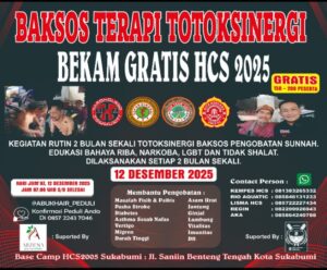 Kegiatan berlangsung di Base Camp HCS 2025, Jalan Saniin, Benteng Tengah, Kota Sukabumi, dimulai pukul 07.00 WIB hingga selesai. Selain terapi totoksinergi dan bekam, juga memberikan edukasi seputar bahaya riba, narkoba, LGBT, serta pentingnya melaksanakan salat sebagai bagian dari pembinaan rohani.
